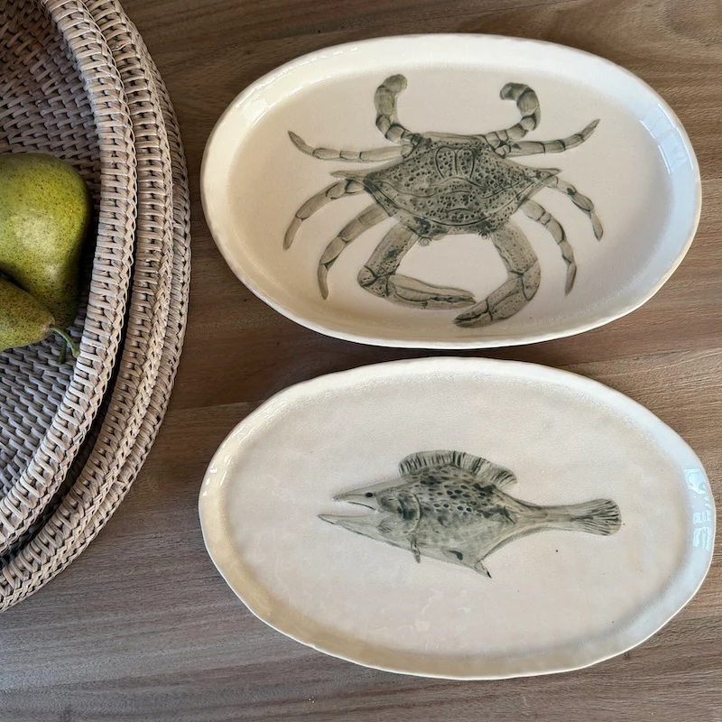 A softly shaped stoneware plate featuring a delicately handpainted crab in muted tones. Its gently irregular form and subtle glaze lend a relaxed, coastal feel—equally suited to serving or as a decorative piece layered into a considered table setting.