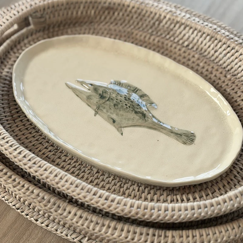Our characterful stoneware plate is adorned with a finely detailed fish motif in soft, natural hues. Its organic shape and understated finish bring a coastal feel to everyday dining or styled displays.